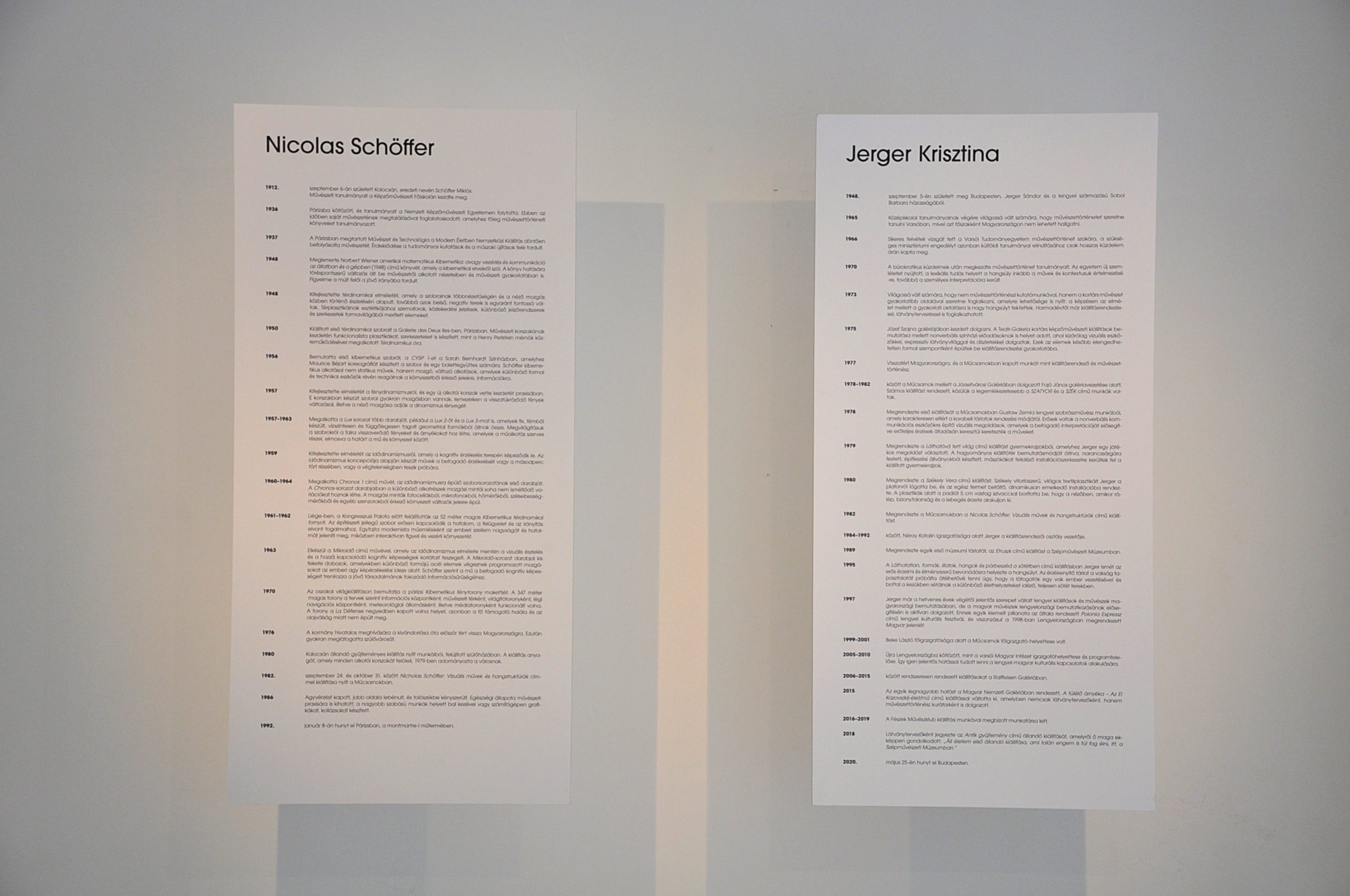 A modernizmus nyers anyagiságának és légies elanyagtalanodásának kettősségejellemzi Nicolas Schöffer művészetét, aki acélszobrait először negatív tereikkel, majdfényreflexióikkal, legvégül pedig időbeliségükkel bővítette ki. A konstruktivista struktúrákfémes matériáit így anyagtalan konceptuális síkokkal ellenpontozta újra és újra. Ezt a kettősséget erősítette meg Jerger Krisztina is kiállításrendezői gyakorlatával, a Nicolas Schöffer: Vizuális művek és hangstuktúrák című 1982-ben, a Műcsarnokbanmegrendezett kiállításban. A Jerger Krisztina-díj második átadása alkalmából e kiállításdokumentációs anyagából válogatott és kiegészített anyagot mutatjuk be. Ez aszelekció a műfajközi átjárásokra, bemutatási lehetőségekre, térkezelési módokraérzékeny kiállításrendező tánchoz, zenéhez, teatralitáshoz való viszonyára fókuszálva szűkíti az érintett személyek, események és dokumentumok körét.