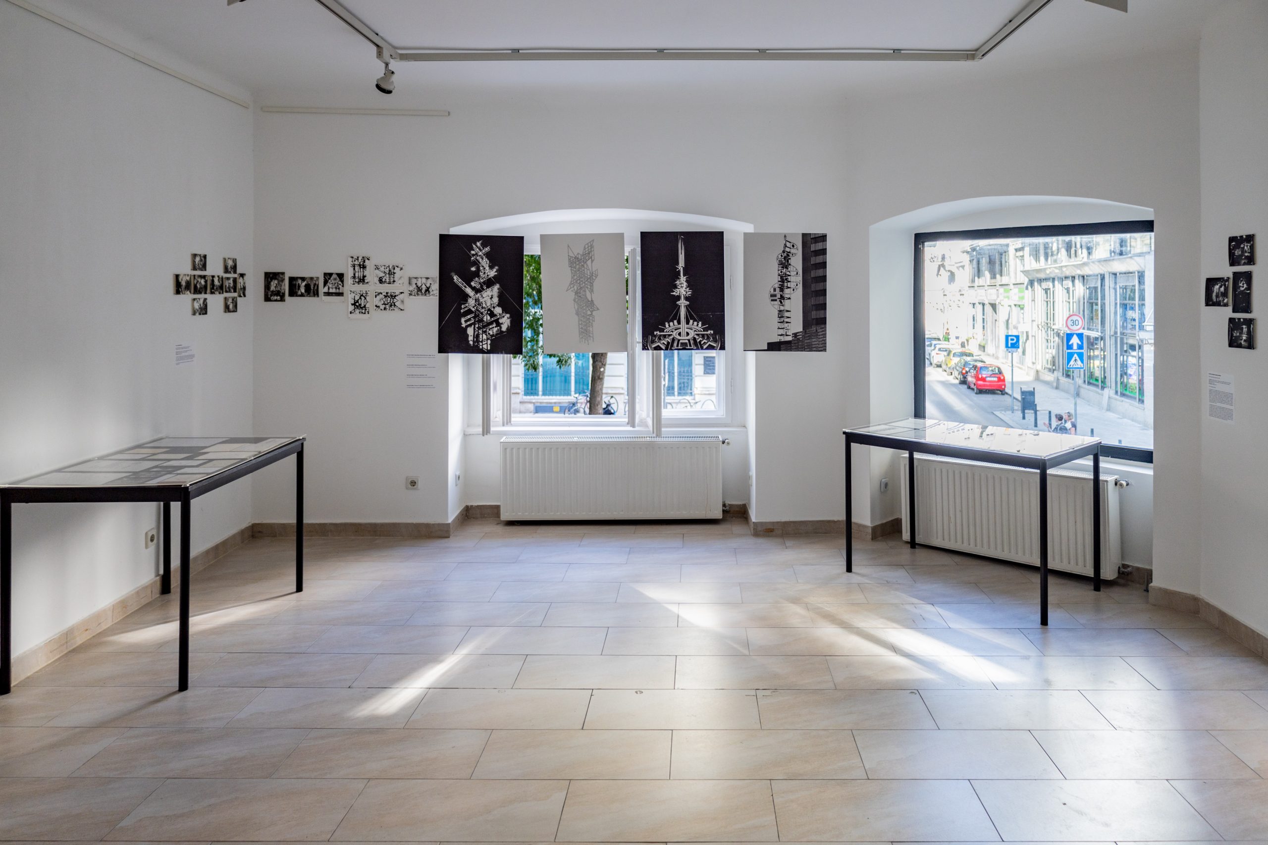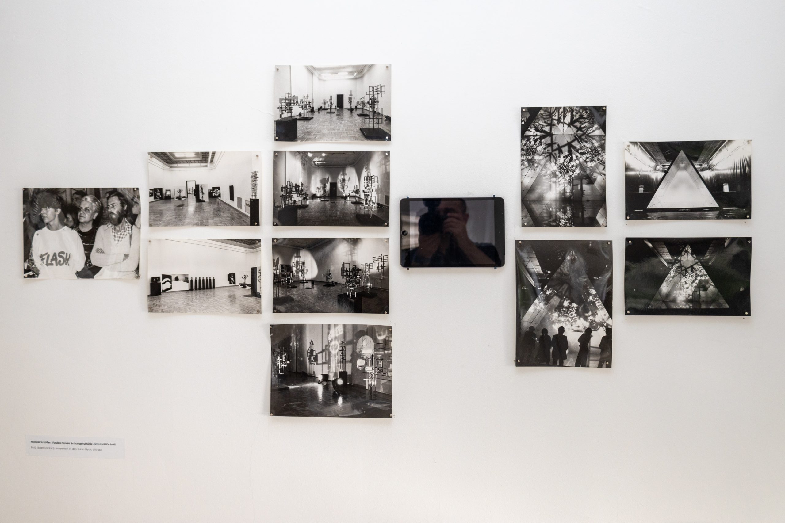Nicolas Schöffer Műcsarnokban rendezett kiállítása három nagyobb tematikus és alkotóirészre bontja a bemutatott műveket. Az első terem széles merítéssel szolgált Schöffer 1955 és 1982 között készített makettjeiből, terveiből és műveiből, amelyekígy bepillantást engedtek szerteágazó, művészeti ágak, területek között határokat nemismerő gondolkodásmódjába. Schöffer koncepcióit, a monumentális léptékűkibernetikus tornyok terveit és makettjeit, illetve a műveihez kapcsolódó„performansz”-dokumentációkat – az emberi test, valamint a kinetikus és kibernetikus, a környezetre is reagáló munkái, fémszerkezetei között teremtett kapcsolatokat – reprodukciókon keresztül mutatták be az első teremben. A fotókat Jerger a plafonróllógatta le: a fal síkjától való eltávolítás, a teret strukturáló lebegés a modernitásrajellemző anyagtalanság érzetét erősítette, s szó szerint „kiléptette” a művekkonceptuális jellegét a térbe. Ez – a Jergerre jellemző, mindig műfajhoz igazított, akárszínpadi(as) elemeket is működtető, ma már megszokott installálás – 1982-ben,Magyarországon igen úttörő bemutatási módnak számított.